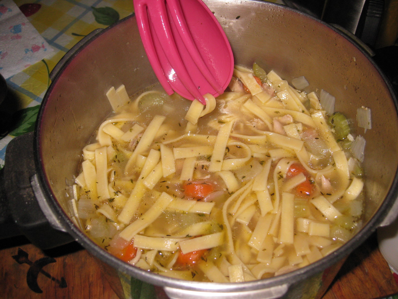 Eventually fished out the pieces that were raw earlier, same deal. Went and putzed again. Came back, tried it, seemed too bland at first so I put in more salt (< mistake, never taste test when your food is hot) then dumped in a bag of freakishly awesome amish egg noodles.