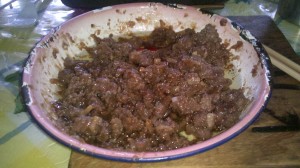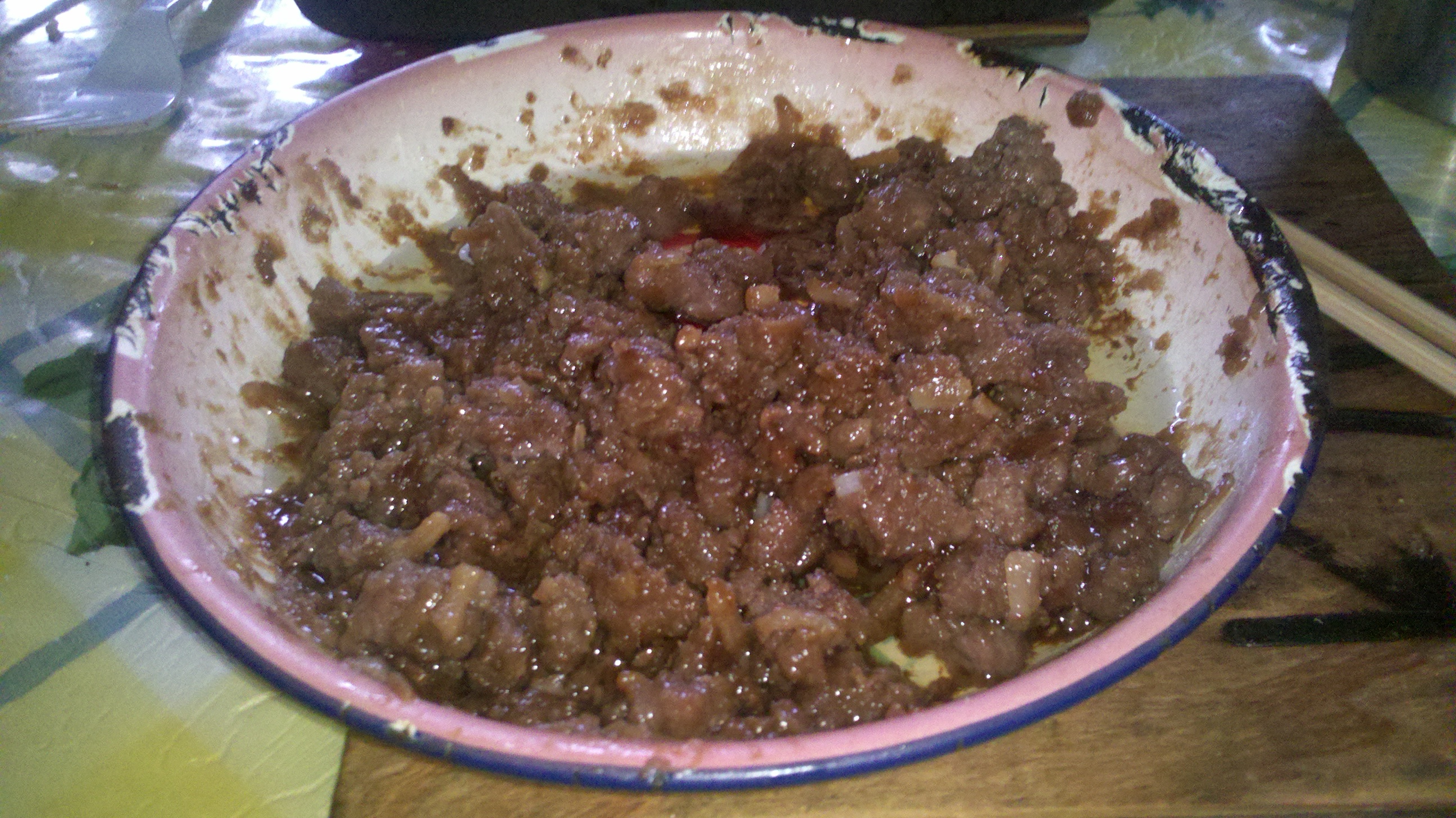 This is comfort food for me (G: same here), one of the few dishes that mommy makes that I look forward to. It’s 1 lb of ground beef steamed in the rice cooker while it is cooking. It is first mixed with a package of onion soup and soy sauce, and it turns into a delectably salty and greasy sung sung that must be eaten with steamed rice. (G: Serious must. Don’t use ultra lean meat, the grease will collect on the sides and you can pour it out, if it’s lean, it’ll just have the wrong texture, don’t use sugar, and the difference between salt and soy sauce is indeed very noticeable.)