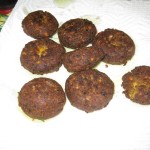 Wanted to document this frying fact: The ratio of hot oil to food put in really makes a difference. The brown falafel was cooked by putting in as many falafel patties as I could at a time, around 8. The dark brown falafel had only 4 cooked at a time. Notice the difference.