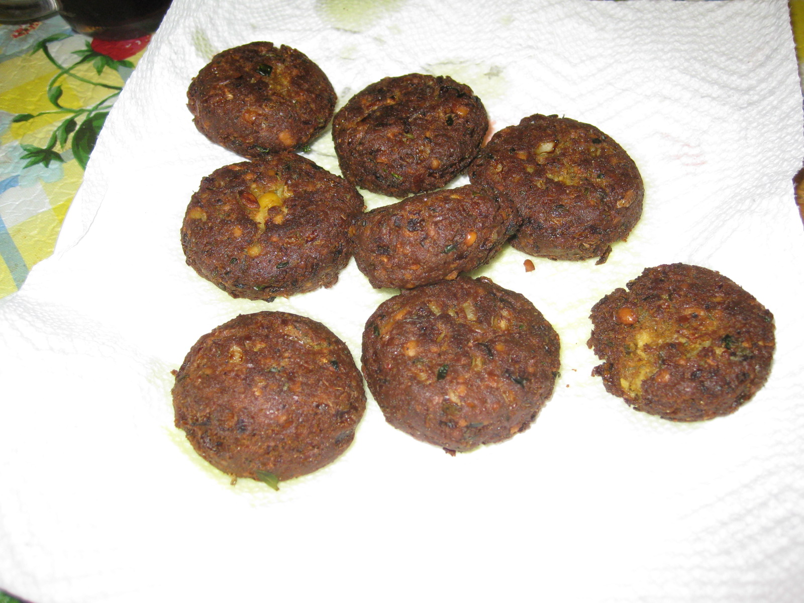 Wanted to document this frying fact: The ratio of hot oil to food put in really makes a difference. The brown falafel was cooked by putting in as many falafel patties as I could at a time, around 8. The dark brown falafel had only 4 cooked at a time. Notice the difference.