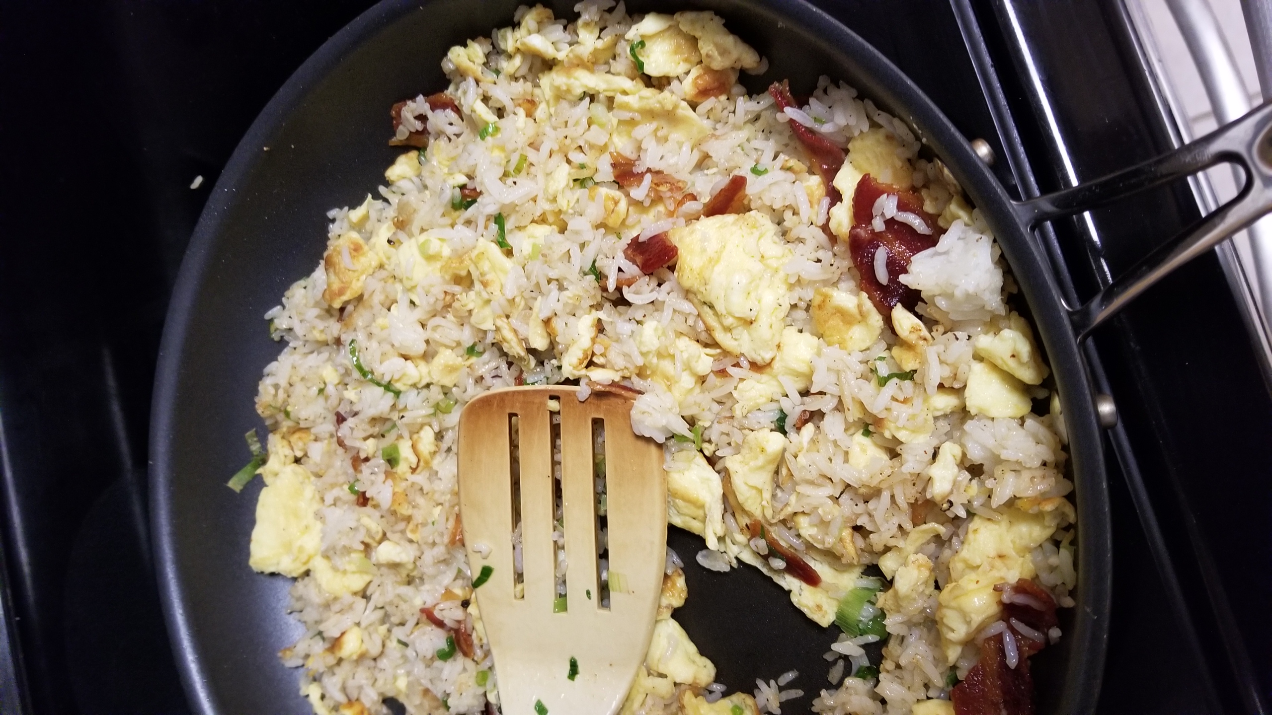 This is fried rice I made in a skillet, controlling the amount of liquid.