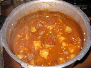 Once the meat was browned (after seasoning it with salt, pepper, red pepper flakes, and chili powder) and quartered, and the potatoes were drained, they were placed in a stock pot, meat first. The microwaved corn, and one can of kidney beans was added.