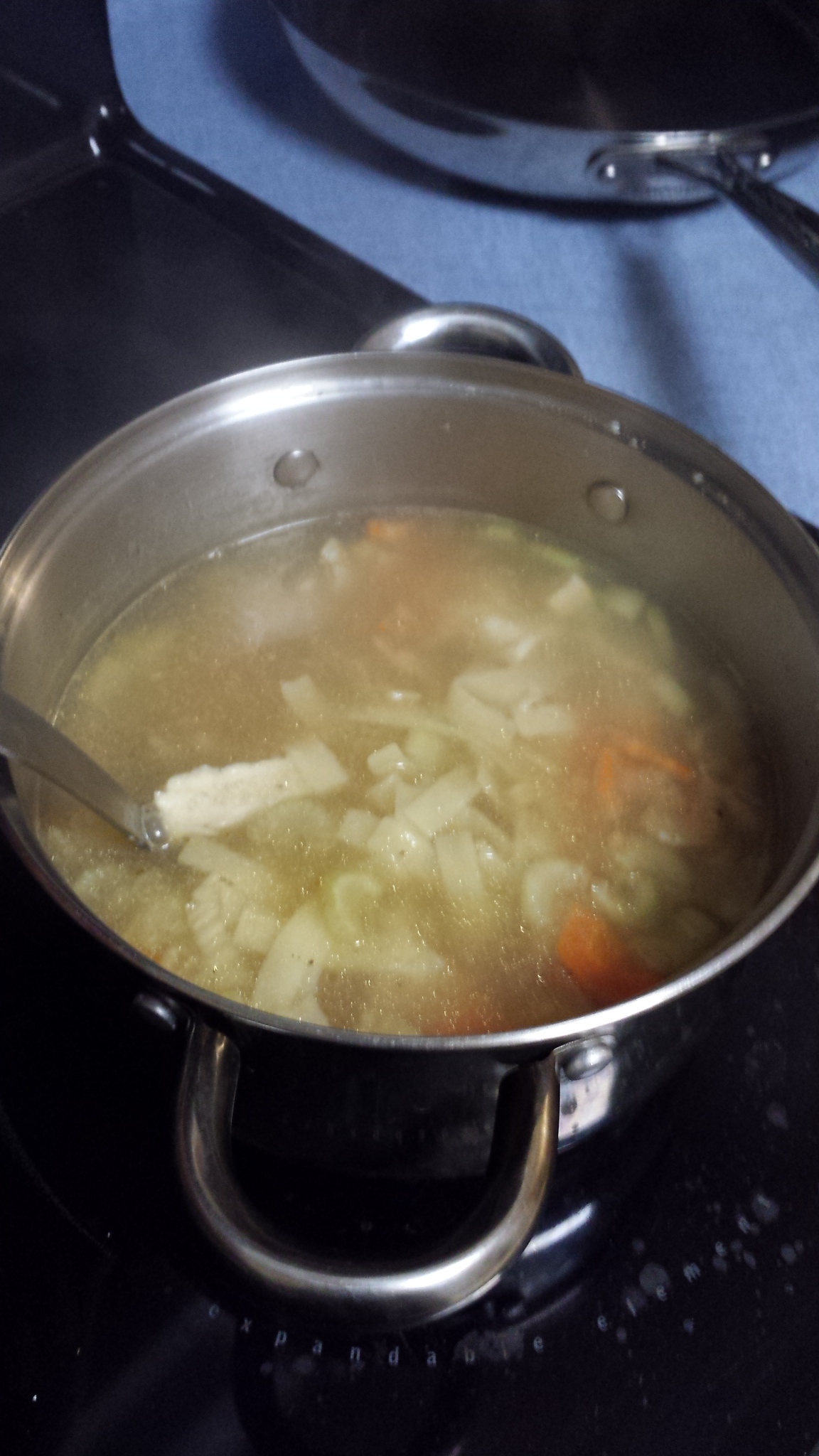 I boiled the broth with the celery and carrot and pepper. Then I microwaved to defrost the chicken. When the broth was at a rolling boil, I added the noodles and chicken.
