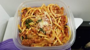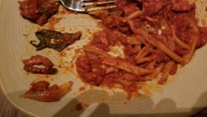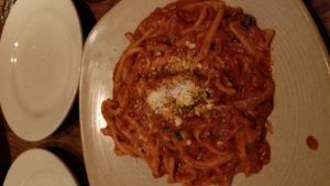 I tried to recreate it at home. Won’t be exactly the same since I don’t have access to fresh bucatini pasta and their type of pancetta, but it was a nice new experiment! To make it exactly their style, I would have to add lots more tomato sauce, probably double the recipe — but the pictured amatriciana doesn’t have to be that saucy. But I was pleasantly surprised how well crushed tomato sauce, simmered with salt, pepper, red pepper and basil tastes. Thanks to Kevan, I may not buy canned pasta sauce again. I have to be careful not to overdo it with the pecorino next time — the sauce is the start of the show.