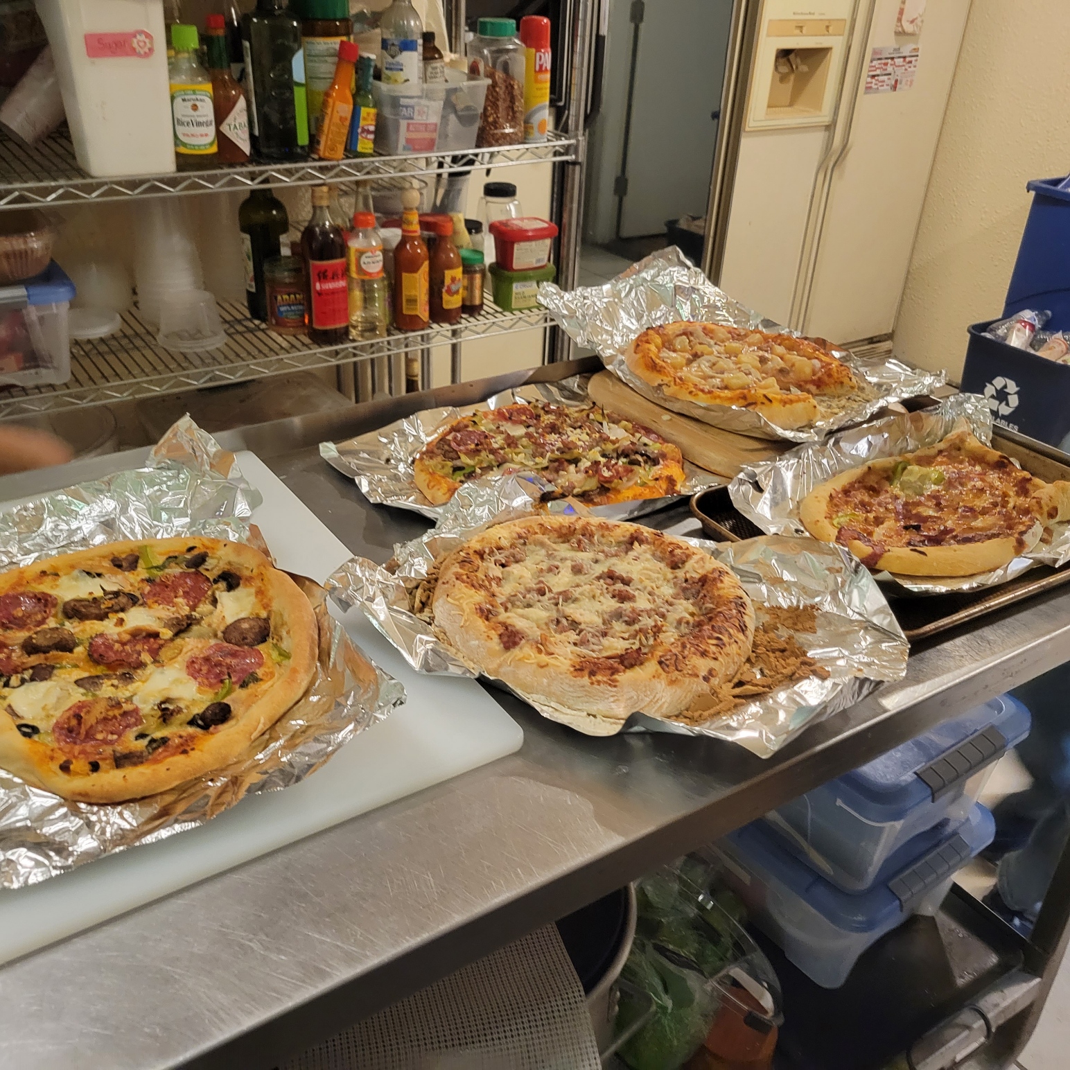 Quadruple recipe (what fits into 6 qt stand mixer) – makes 16 personal sized pizzas, or 8 medium pizzas. Medium pizza is half a baking sheet.