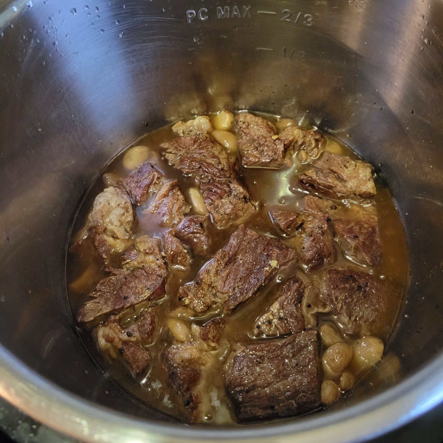 Put seared meat into pressure cooker/instant pot. For my 6 qt. instant pot I put 1 cup of deglazing liquid with a bunch of garlic.