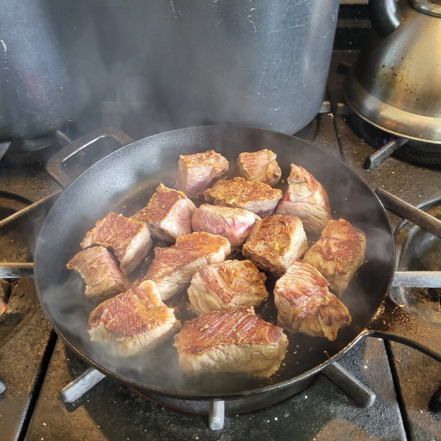 - Salt beef cubes on all sides and sear beef roast. I don’t use oil to sear beef — browning adds that depth of beefiness that can’t be replicated with seasonings.